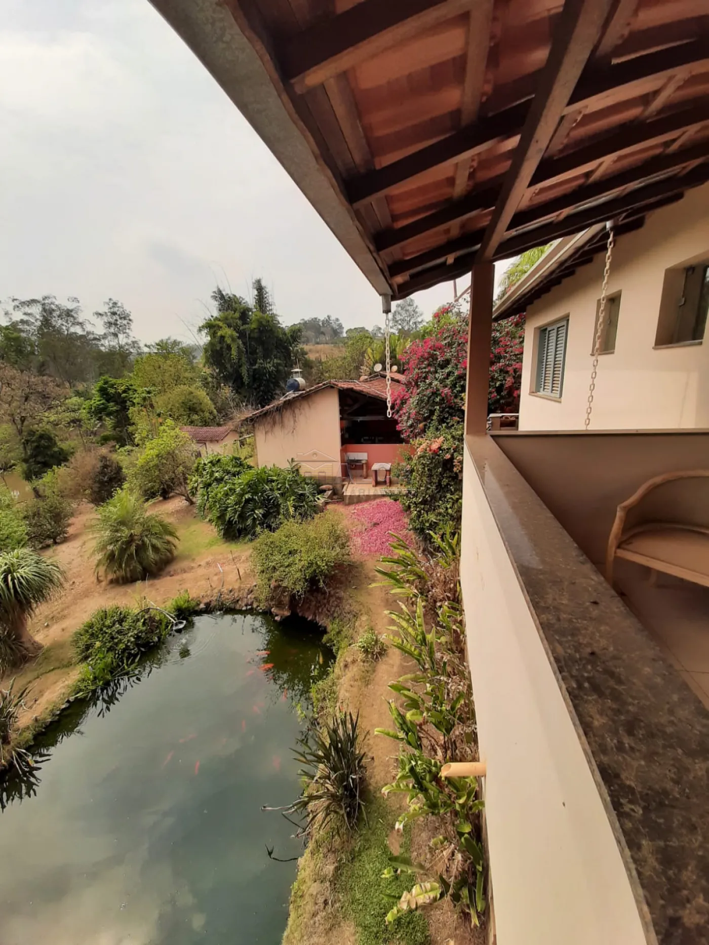 Quiosque com balanço em frente ao lago com carpas