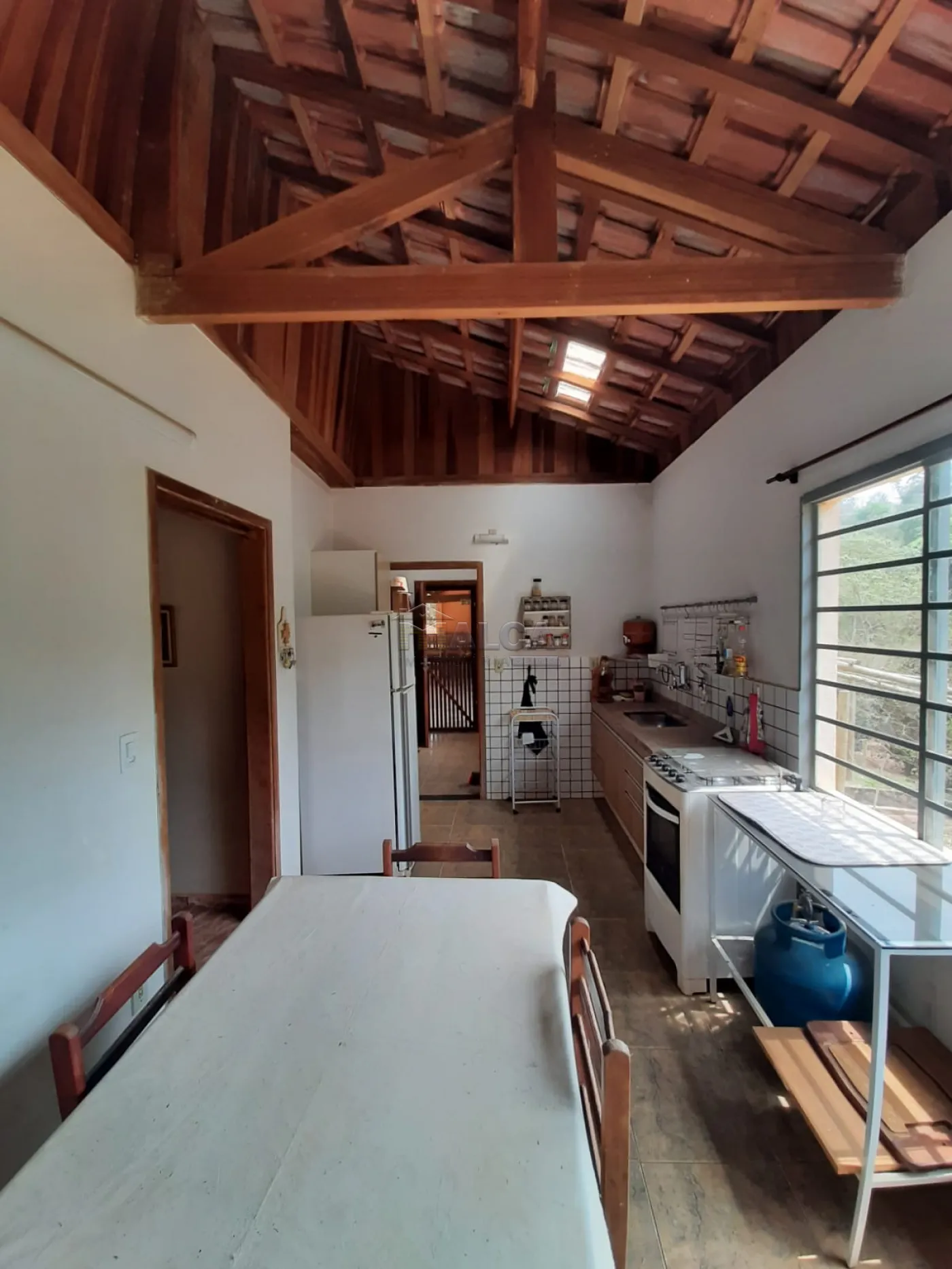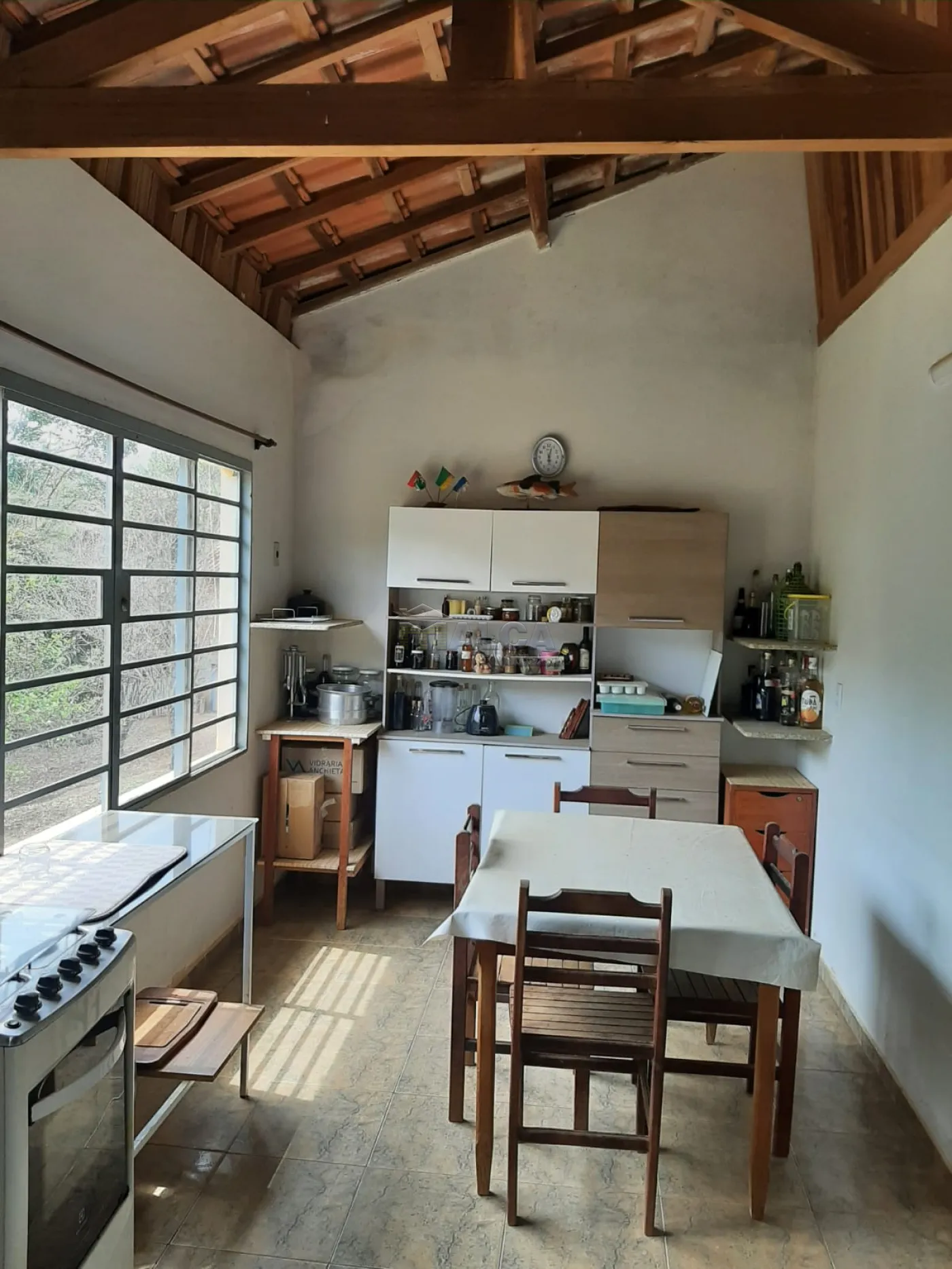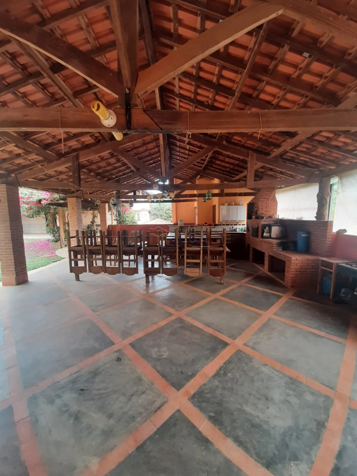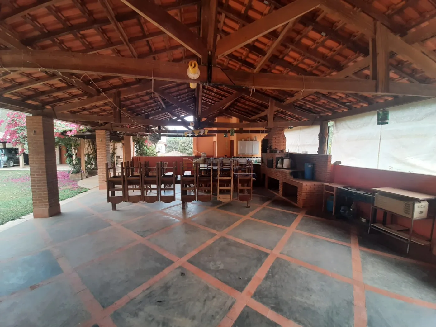 Barracão amplo, muito bem estruturado e coberto, possui churrasqueira, forno e fogão a lenha, com 2 banheiros (porta ampla para acesso a cadeirante)